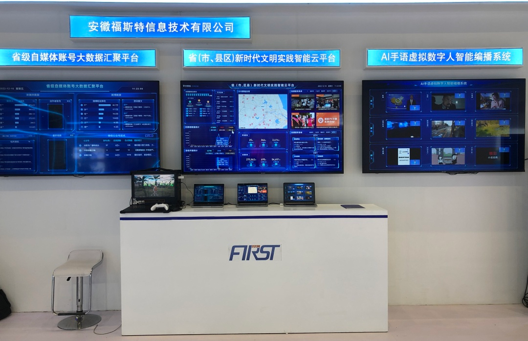 安徽福斯特信息技術有限公司此次應邀參展,以廣電媒體發(fā)展為亮點,集中展示大數(shù)據(jù)、人工智能,呈現(xiàn)了AI-VLOG視頻智能合成系統(tǒng)+AI手語虛擬數(shù)字人智能編播系統(tǒng)+省級自媒體賬號大數(shù)據(jù)匯聚平臺+?。ㄊ小⒖h區(qū))新時代文明實踐智能云平臺技術。